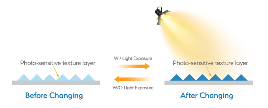 A new hybrid type of optical functional film is achieved by integrating microstructures and photo-triggering chromic materials as our latest developed products. It can provide much more attractive appearance through light operation and color change for decoration purpose. Also, it could be a self-tunable component for intensity of luminaires. There are still various interesting applications waiting for you to explore.