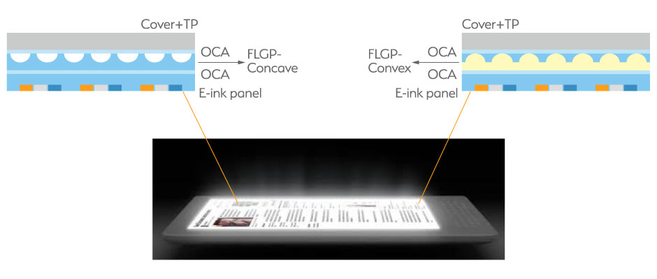 Taking the advantage of highly conformal transformation of microstructures (nearly 100% replication) by UV-curing process more freedoms of optical designs for front light guide plate (FLGP) of e-ink displays is accessible. Different from the performance of hot-embossing process the illumination light field could be finely and wisely modified to fit the optimal conditions for the panel configuration. Concave and convex textures are both available to accomplish for different design configurations.