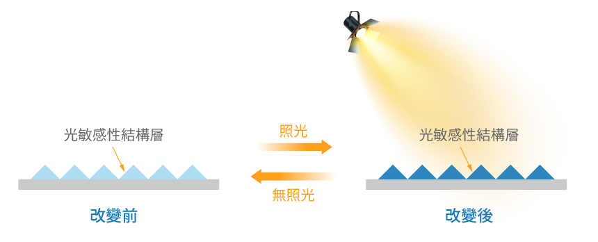 透過光學微結構設計與光驅動變色材料整合所開發之全新複合式多功能光學膜(專利申請中),可提供更具吸引力之光操作應用與變色裝飾彈性。此外,更可作為一種自調光型強度調光元件使用。更多的應用可能性有待您來發掘。