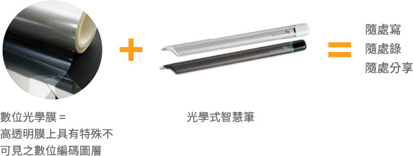 一種可在任意表面上以簡易、極具成本效益之設置方式達成電子化輸入介面之光學膜材,需搭配專用之數位光學筆。